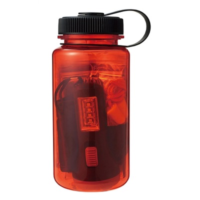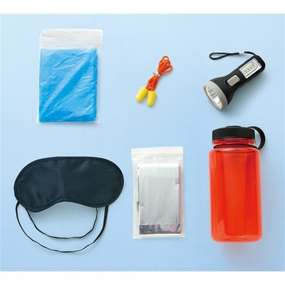 | サイズ | 本体サイズ/1.ウォーターボトル/直径8cm 高さ17.2cm(適正容量/約600ml) 2.レインポンチョ/着丈約100cm 胴回り約165cm(フリーサイズ) 3.アルミブランケット/約140×70cm 4.2WAYライト/直径4.8cm 全長10.3cm 5.アイマスク/約18.5×8.5cm 6.耳栓/全長約65cm パッケージサイズ/8.5×8.5×19.4cm |