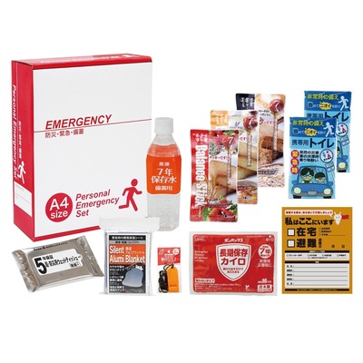 | その他 | <セット内容>・バランススティック×3・携帯用トイレ(凝固剤付き)×2・7年保存水(500ml)×1・静音アルミブランケット(約130×210cm)×1・カイロ×1・ホイッスル×1・ 緊急避難カード×1・ウェットティッシュ(20枚)×1 |