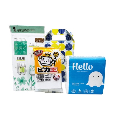 | その他 | <セット内容> ・ハローハーフサイズソフトパックティシュ180W×1 ・ピカ王ミニ×1 ・エコな手提げポリ袋(15L用)2枚入×1 ※ハローハーフサイズソフトパックティシュ180Wは2色不均等アソートになります。 |