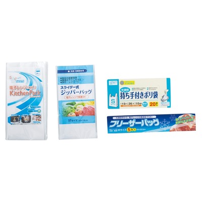 | その他 | <セット内容> ●持ち手付きポリ袋S20枚BOX×1 ●フリーザーバッグM5枚×1 ●レンジもOKキッチンパック10枚×1 ●スライダー式ジッパーバッグM1枚×1 |