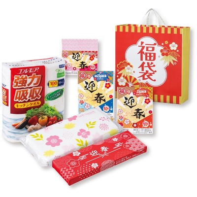 | その他 | <セット内容> ●エルモアキッチンタオル2ロール×1 ●ソフトパック入りティッシュ40W×1 ●迎春キッチン用ポリ袋10枚BOX×1 ●迎春ジパック(冷凍)1枚入×1 ●迎春ジパック(冷蔵)1枚入×1 ●拭く拭く福ふきん(抗菌)×1 |