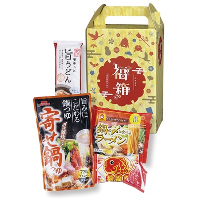 | その他 | <セット内容> ・イチビキ 寄せ鍋つゆ720g×1 ・東洋水産 鍋の〆に食べるラーメン70g(1〜2人前)×1 ・モチっと旨うどん200g×1 ・福福鯛×1 ・ハートふりかけ紀州南高梅2.5g×1 賞味期間/70日 |
