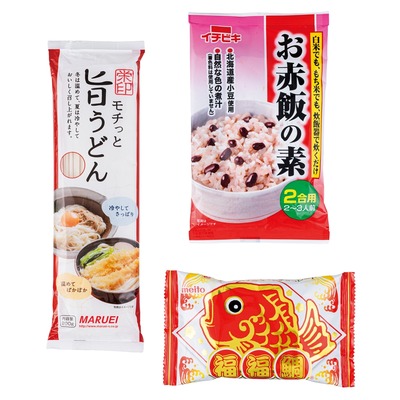| その他 | <セット内容> ・イチビキ 寄せ鍋つゆ720g×1 ・イチビキ 赤飯の素2合用100g×1 ・本醸造しょうゆ300ml×1 ・モチっと旨うどん200g×1 ・福福鯛×1 ・ハートふりかけ紀州南高梅2.5g×1 賞味期間/70日 |