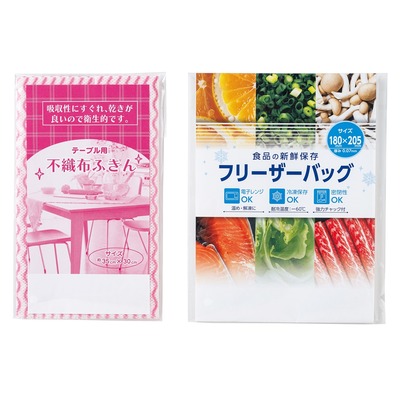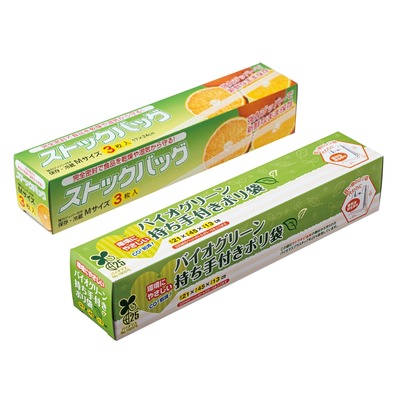 | その他 | <セット内容> ●調理ができるキッチンパックM50枚×1 ●バイオグリーン持ち手付きポリ袋3枚×1 ●ストックバッグM3枚×1 ●フリーザーバッグ1枚×1 ●不織布ふきん1枚×1 |