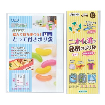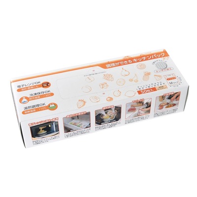 | その他 | <セット内容> ●調理ができるキッチンパックM50枚×1 ●冷蔵・冷凍保存フリーザーバッグ(厚さ0.4mm)3枚×1 ●冷蔵・冷凍保存フリーザーバッグ(厚さ0.7mm)3枚×1 ●消臭袋1枚×1 ●とって付きポリ袋M1枚×1 ●水切りネット1枚×1 ●不織布ふきん1枚×1 ●スライダー式ジッパーバッグ1枚×1 |