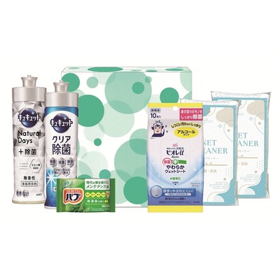 | その他 | <セット内容> ・花王 キュキュット220ml(クリア除菌)×1 ・花王 キュキュット220ml(Natural Days+除菌無香性)×1 ・花王 ビオレu除菌やわらかウェットシート10枚(アルコールタイプ)×1 ・花王 バブ(森の香り)×1 ・ネットクリーナー×2 |