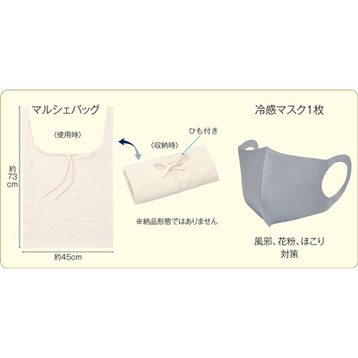 | サイズ | 本体サイズ/マルシェバッグ/約45×10×73cm(使用時) 約11.5×16.5×3.5cm(折りたたみ時) 冷感マスク/約17.5×13cm |